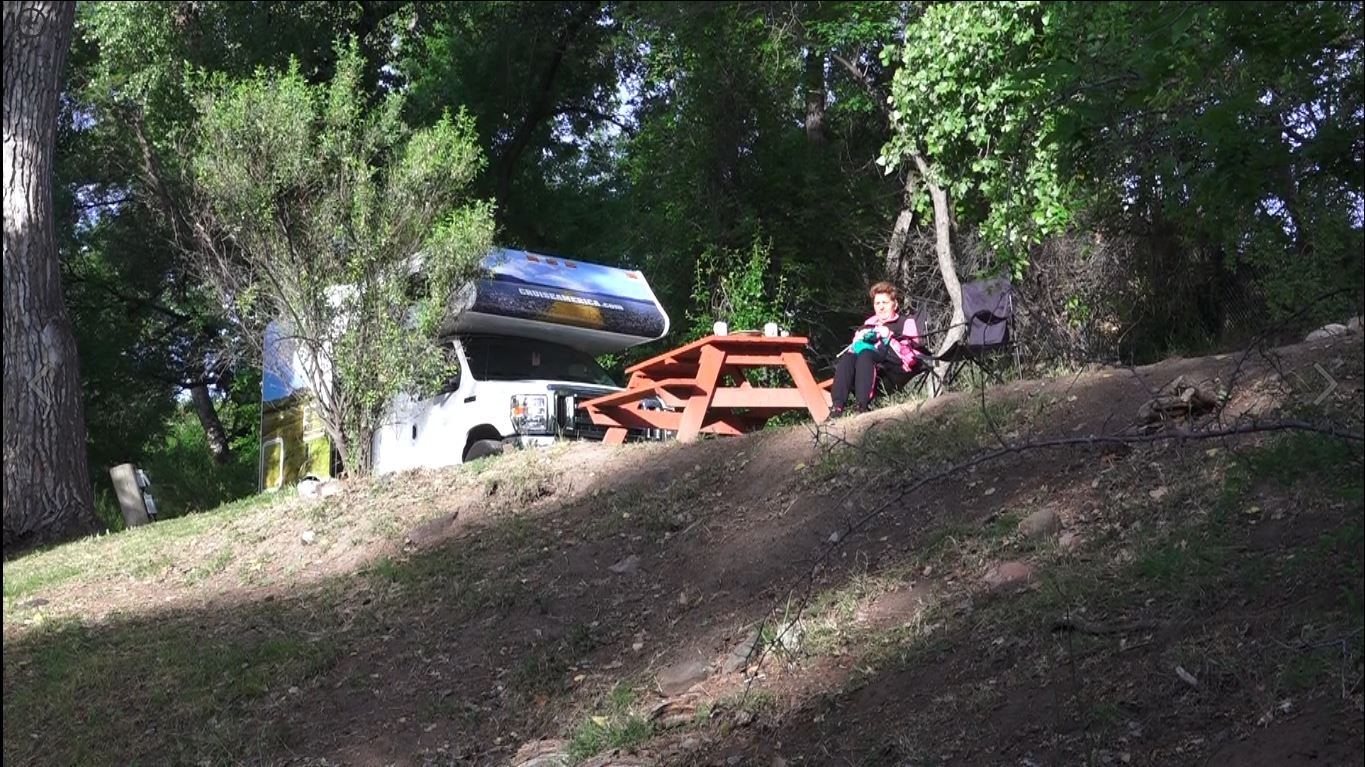 Om half 5 al weer wakker, het tijdverschil nog niet gewoon en maar liggen wachten tot ik er uit mag. Ach wat, om 6 uur eruit, heb zo gewoon extra tijd om van ons paradijsje te genieten! Met een grote kop thee lekker zitten luisteren naar het ontwaken van de natuur en de zon op zien komen. Heerlijk dat geluid van de Oak creek die beneden langs stroomt. De kolibrie is een heel klein vogeltje dat hier veel voorkomt, fladderde vlak naast me. Heel veel andere vreemde vogels gezien die zich waarschijnlijk afvroegen wie deze vreemde vogel was. De naam van de camping klopt wat mij betreft helemaal; Lo lo mai is een Hopi indianen woord en betekend beautiful of Aloha.
