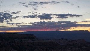 Nog moe van de vorige dag zijn wij zeer vroeg opgestaan rond 5 uur s’morgens. Doel is naar sunrise point te gaan en de zonsopkomst te filmen. Warme kleren aan want het is koud, zeer koud. In het donker nog naar de rim (rand van de canyon) en langs het snelle pad omhoog naar Sunrise Point. Het werd langzaam wat lichter. Toen wij aankwamen was er nog niemand. Zouden wij de enige gekken zijn? Nou nee hoor, al snel stond het hele platform vol. De lucht werd eerst rood. Daar waar ie opkwam waren precies wolken. De onderkant van deze wolken werden donker rood net of ze in brand stonden. Later oranje, prachtig. En kon niet missen kwam de zon er boven uit. Wel gelijk fel nu, dus het effect wat de rode zon op de rode aarde zou moeten hebben, ging helaas aan onze neus voorbij.